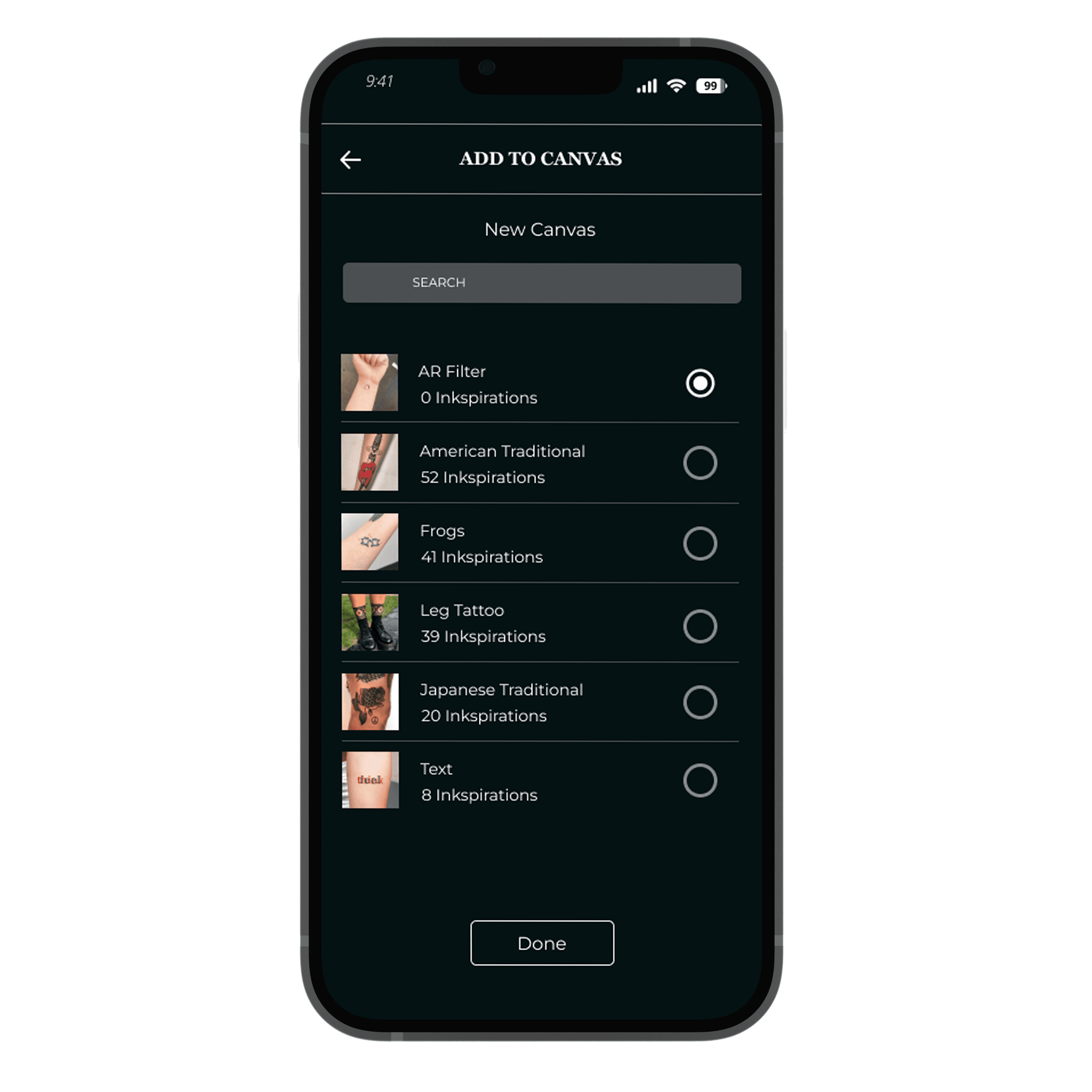 If a user feels inspired by a particular tattoo, they can add the ink to their canvases.